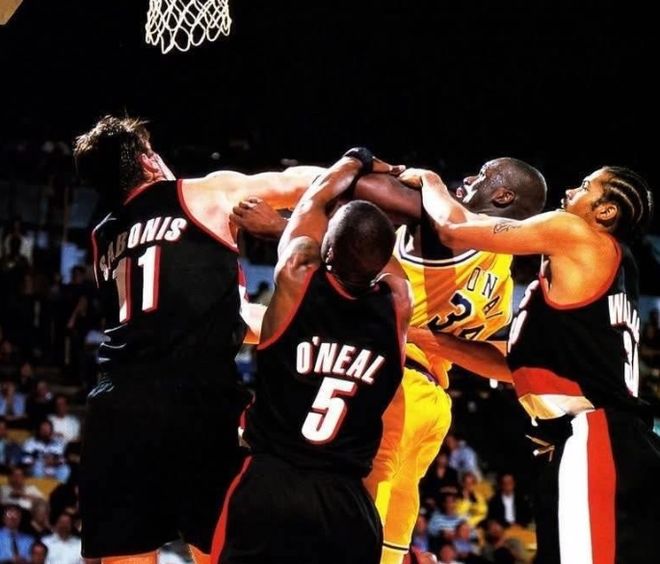 2000年西部决赛,开拓者甚至不惜使用四人收缩来应对,只要奥尼尔一接球,就有四名球员同步压迫禁区。正因这种极端防守,联盟在2001年出台了防守三秒规则,甚至放宽区域联防,也间接导致传统中锋走向没落。