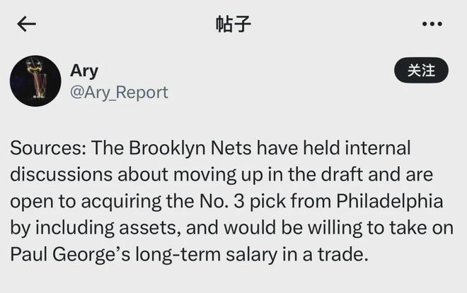 美记:篮网愿意通过打包资产的方式,从费城手里换来首轮第3号签,同样愿意接手乔治的长期合同。